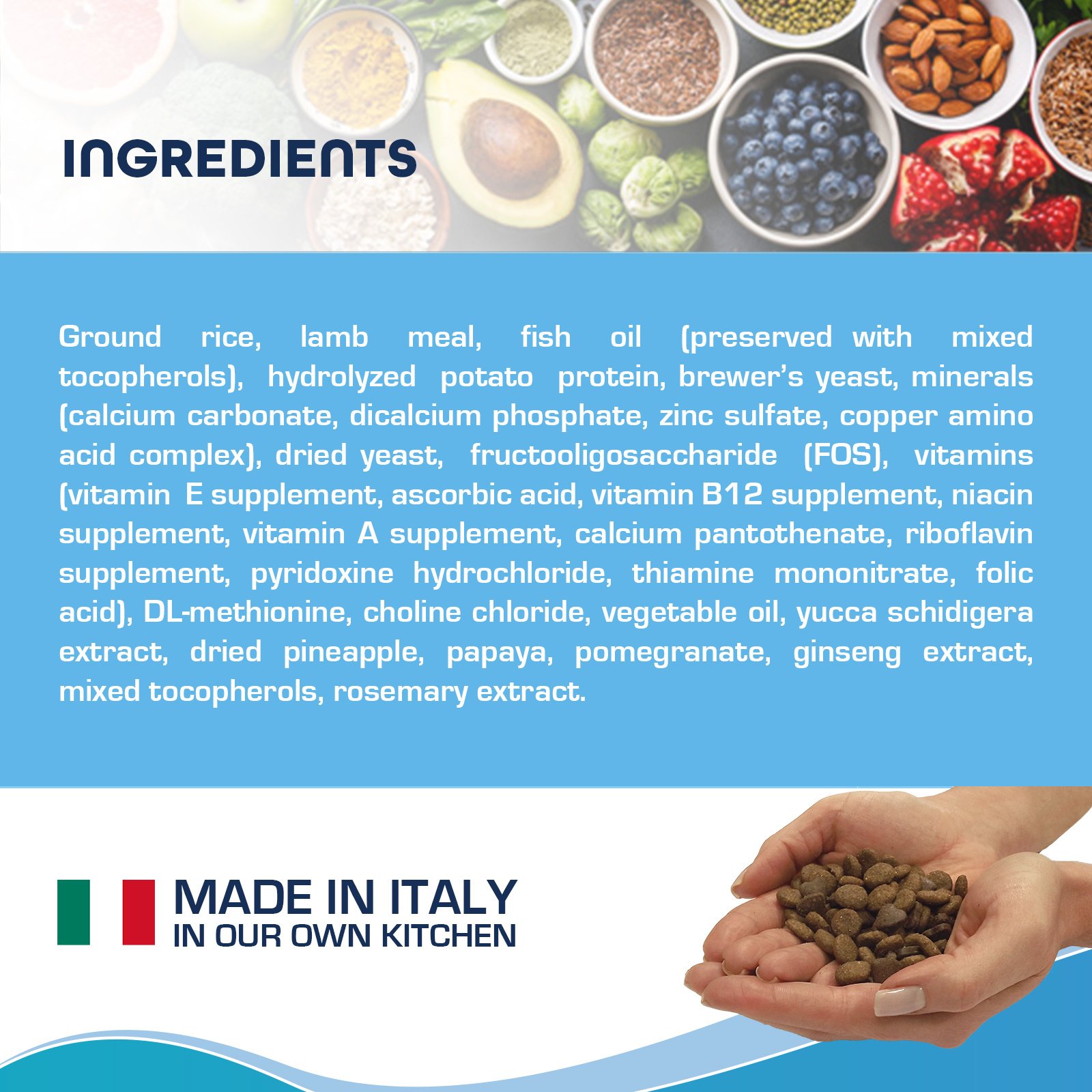 ground rice, lamb meal, fish oil (preserved with mixed tocopherols), hydrolyzed potato protein, brewer's yeast, minerals (calcium carbonate, dicalcium phosphate, zinc sulfate, copper amino acid complex), dried yeast, fructooligosaccharide (FOS), vitamins (vitamin E supplement, ascorbic acid, vitamin B12 supplement, niacin supplement, vitamin A supplement, calcium pantothenate, riboflavin supplement, pyridoxine hydrochloride, thiamine mononitrate, folic acid), DL-methionine, choline chloride, vegetable oil, yucca schidigera extract, dried pineapple, papaya, pomegranate, ginseng extract, mixed tocopherols, rosemary extract.